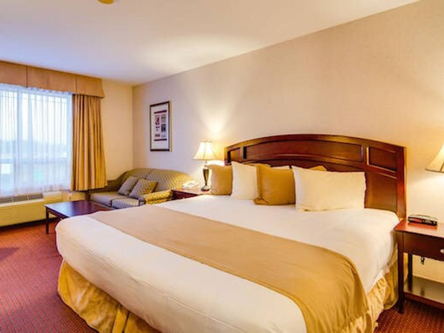This room features one King bed, a flat-screen TV, a mini fridge, a microwave, a coffeemaker, an iron and ironing board, a full bathroom, a hairdryer and bathroom amenities.