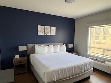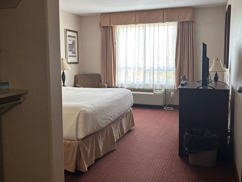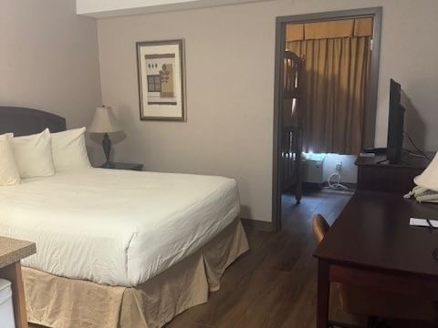 This room features one King bed, a flat-screen TV, a mini fridge, a microwave, a coffeemaker, an iron and ironing board, a full accessible bathroom, a hairdryer and bathroom amenities.