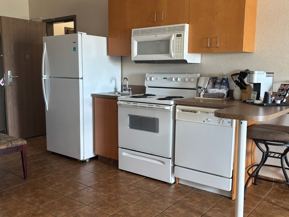 Our Junior Suite features one King Bed, one sofa bed, a flat-screen TV, a dishwasher, a microwave, a coffeemaker, an iron and ironing board, a full bathroom, bathroom amenities and a full kitchen.