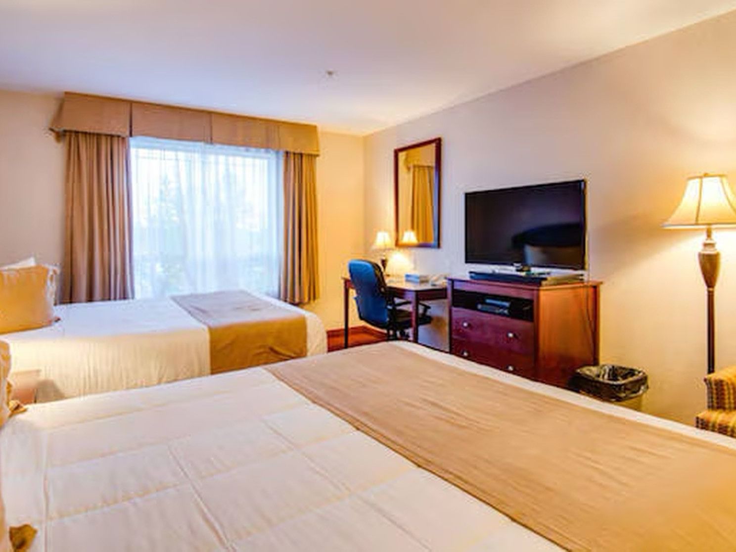 This room features two Queen beds, a flat-screen TV, a mini fridge, a microwave, a coffeemaker, an iron and ironing board, a full bathroom, a hairdryer and bathroom amenities.